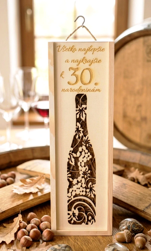 - Drevená krabica na fľašu s venovaním na narodeniny