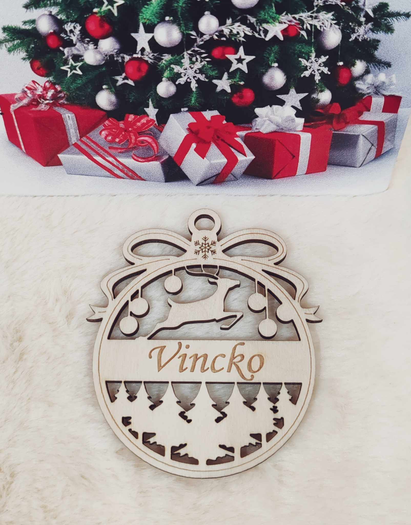 Drevená vianočná ozdoba s menom na stromček guľa - stromčeky