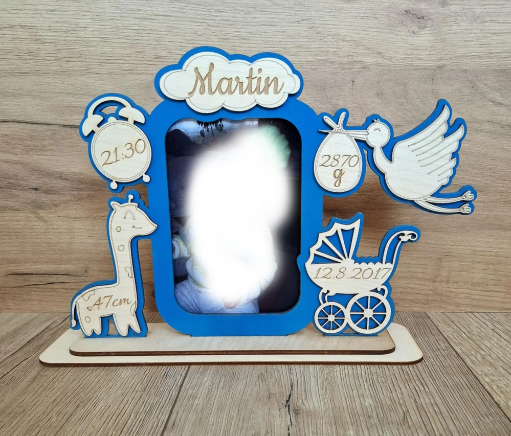 - Drevený fotorámik s menom k narodeniu dieťaťa