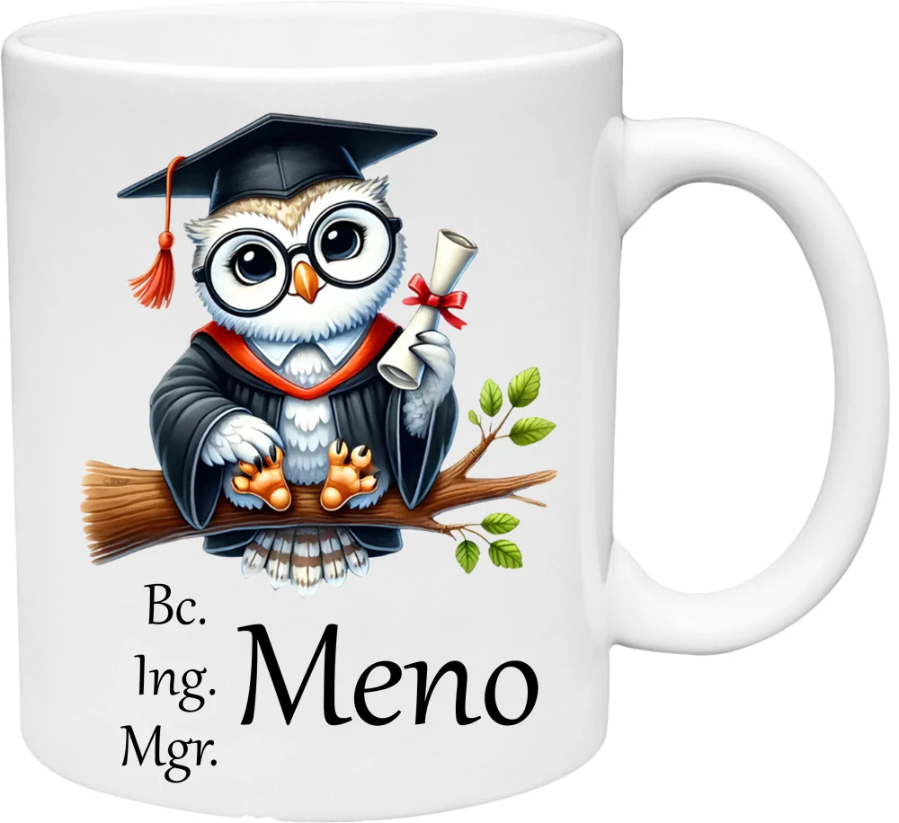 Hrnček k promóciám Sovička. Vhodný do umývačky riadu a do mikrovlnky. Hrnček je zabalený do krabičky.