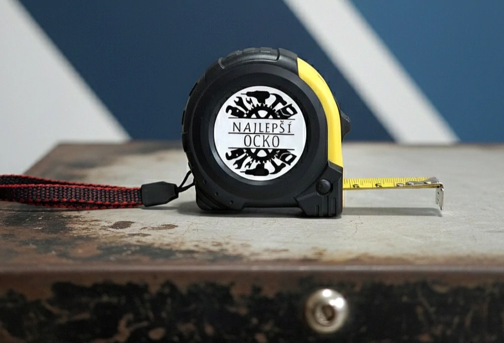 Navíjací meter.Kovová 5 m páska, v odolnom puzdre so zámkom a sponou na pripevnenie na opasok.
