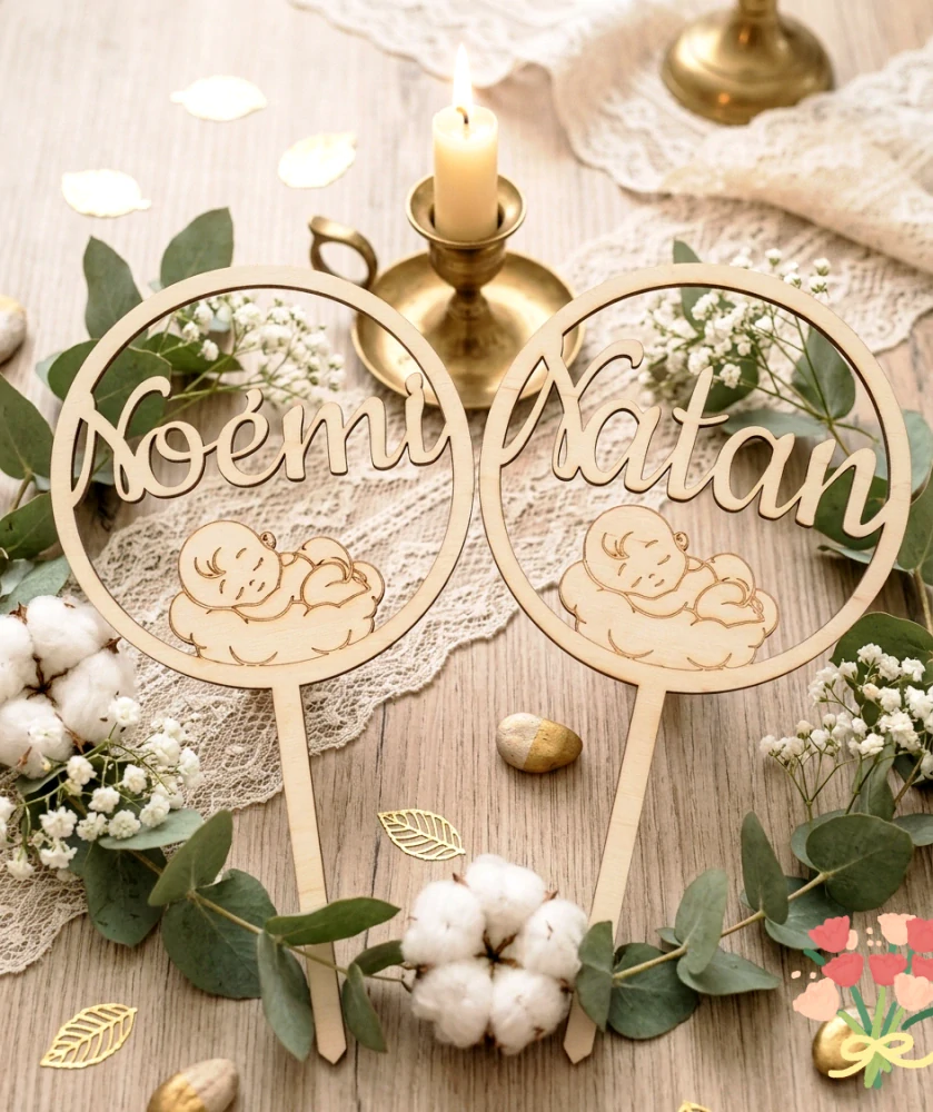 Okrúhly drevený zápich do torty na krstiny.