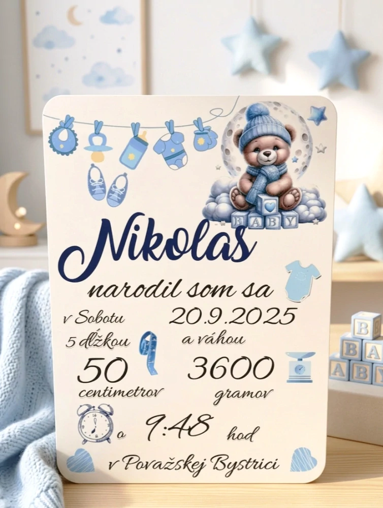 Drevený obraz s grafickým zobrazením mena, dátumu, miesta, času narodenia, váhy, dlžky novorodenca je originálnou pamiatkou pripomínajúcou moment narodenia dieťaťa.