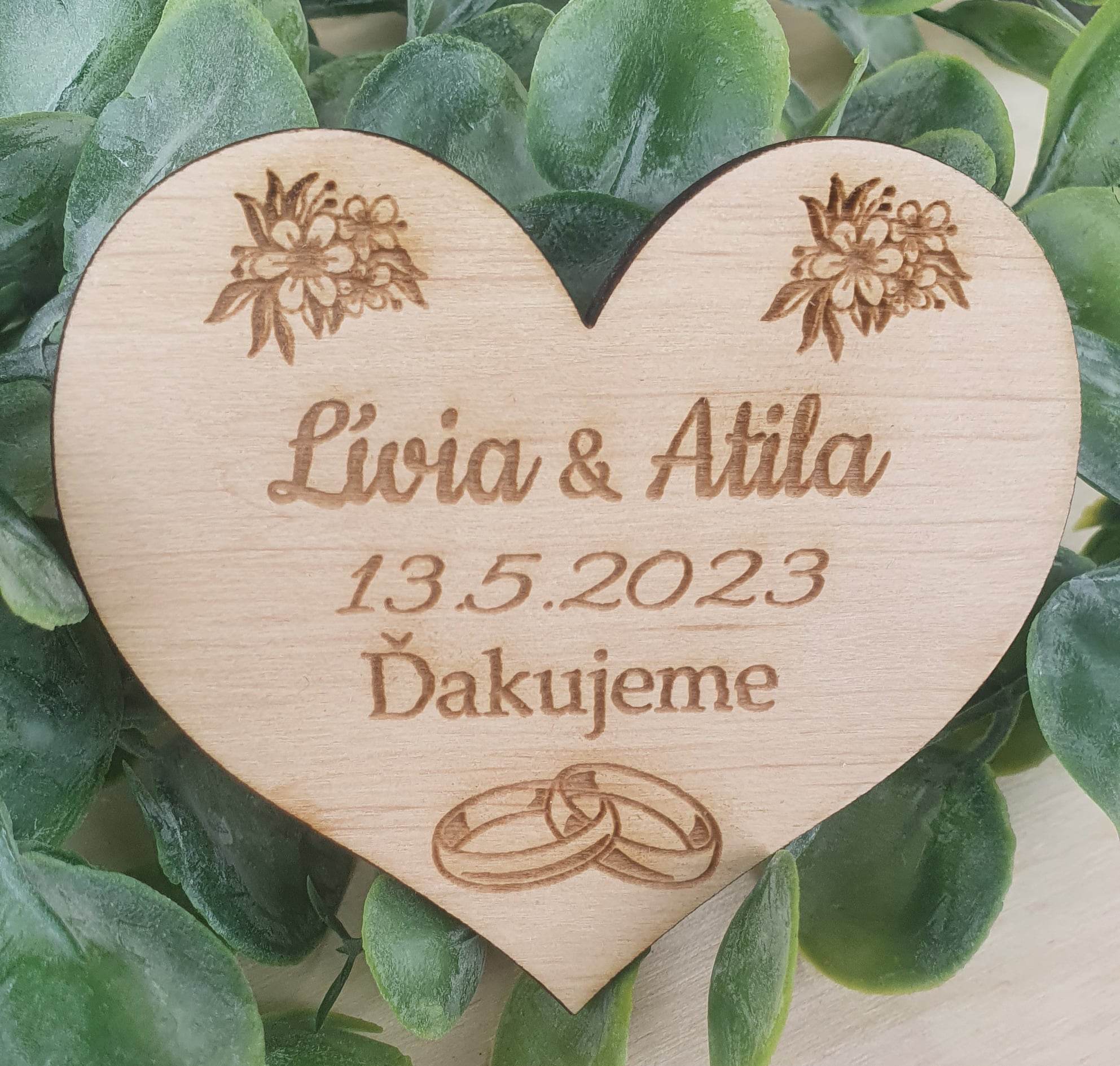 Svadobná drevená magnetka srdiečko kvietky